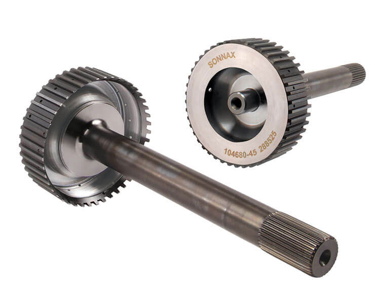 In place of the two-piece shaft/hub, Sonnax uses a much stronger, one-piece design that eliminates the OE assembly’s weak, welded connection. The one-piece design is custom forged from ultra high-strength 300M billet steel, then heat treated and shot peened for added durability. This combination of features guards against broken 4-5-6 hubs and the risk of rear splines shearing off — chronic failures in performance cars and trucks as well as heavy commercial vehicles.