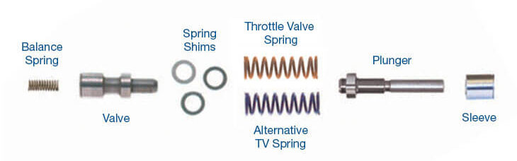 The TV bore wears out easily in listed Chrysler RWD transmissions, with the 48RE seeing much higher rates of poor line pressure rise and inconsistent shift timing compared to earlier units. This Sonnax heavy duty throttle valve kit is ideal for earlier, wide-open throttle shift points in new or lightly used valve bodies. The modified valve reduces gear hunting and the need to back off the throttle when shifting under heavy load. An optional balance spring improves throttle control if the bore shows minimal wear.