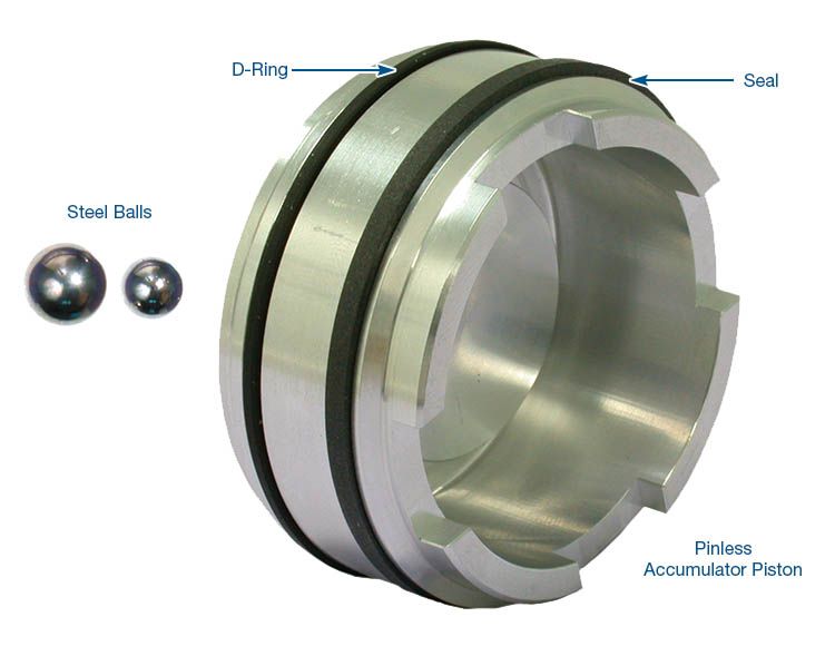 The Sonnax patented pinless design with dual seals stabilizes the piston in the bore and provides improved sealing characteristics. Use of the Sonnax part eliminates the need for the pins.