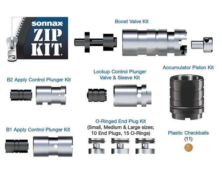 This Sonnax Zip Kit U151E-U250E-ZIP targets the root cause of multiple complaints by sealing the critical circuit pressure losses in the Toyota U151E/F and U250E valve bodies. The kit contains uniquely designed parts to prevent the loss of pressures within the main line, B2 and B1 control, solenoid modulator and lockup control circuits. The kit also seals multiple circuits known to suffer from end plug leakage or poor check ball sealing. No special tools are required for installing these parts.